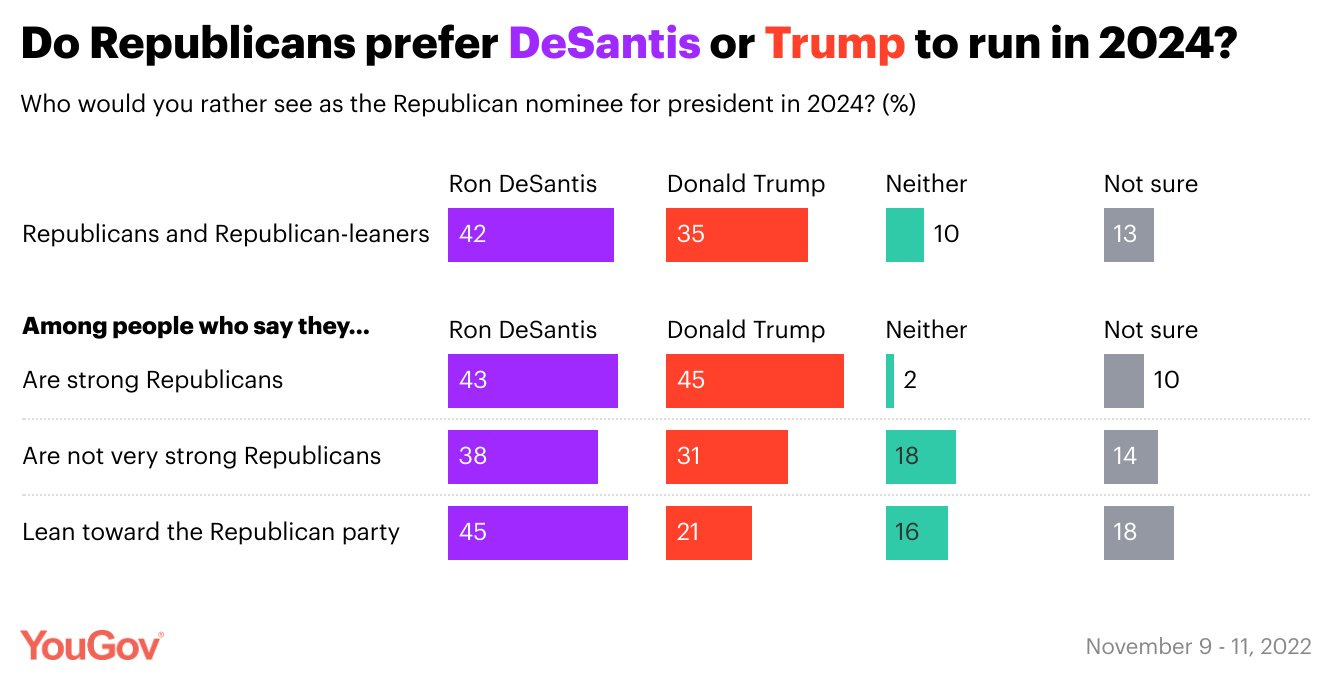 Il risultato è stato pessimo: gran parte dei suoi candidati (come Mehmet Oz in Pennsylvania e Doug Mastriano in Pennsylvania, nonché Blake Masters in Arizona) sono andati incontro a pesanti sconfitte. La conseguenza peggiore, però, riguarda la sua presa sul partito, dato che in virtù di questo risultato sono molti gli esponenti del mondo conservatore che gli stanno chiedendo un passo di lato in vista del 2024. Sono arrivati anche numerosi attacchi diretti, in cui Trump è stato definito il responsabile delle difficoltà avute in questa tornata, in virtù delle poche chance di vittoria: l’esempio più lampante, probabilmente, è quello di Fox News, la più importante televisione conservatrice che con un articolo ha incoronato la leadership di DeSantis, individuando invece in Trump la causa del deludente risultato elettorale.