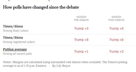 Nei giorni successivi al dibattito sono usciti diversi sondaggi che possono essere utili per capire l’andamento dell’opinione pubblica. Per una rilevazione di New York Times/Siena College, il margine si è aperto rispetto ai tre punti di vantaggio a favore di Trump relativi a qualche settimana fa: il risultato, ora, sarebbe di 49% a 43% in favore del tycoon. Data for Progress, ovvero uno dei pochi sondaggisti che nei giorni precedenti al dibattito dava avanti Joe Biden, ora vede Trump avanti con un lieve margine, mentre CBS News/You Gov ha visto il candidato del Partito Repubblicano crescere di un punto.