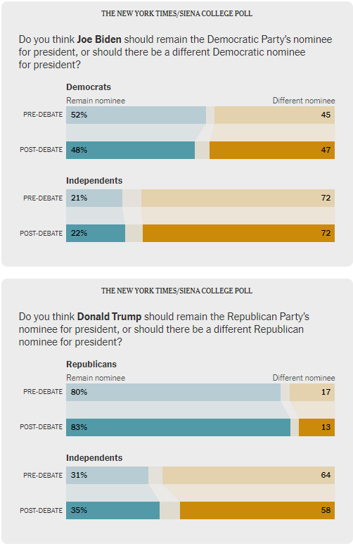 Sempre il già citato sondaggio di New York Times/Siena College evidenzia come Trump abbia guadagnato terreno tra gli elettori maschi, passando da un vantaggio di 12 punti pre-dibattito a 23 punti post-dibattito. Al contrario, il margine di Biden tra le donne elettori è aumentato leggermente, da cinque a otto punti. Tra coloro che hanno seguito il dibattito, il 60% ritiene che Trump abbia fatto meglio, contro il 22% che preferisce Biden. Solo il 16% degli elettori pensa che Biden abbia avuto una buona performance.